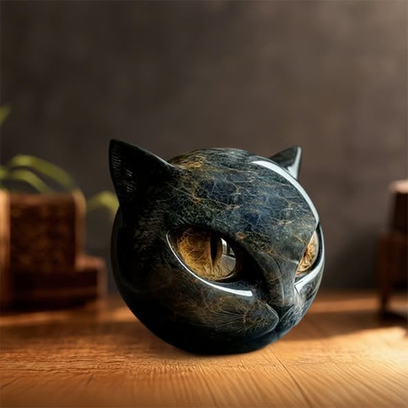 Stellen Sie sich den Moment vor, in dem Sie es in Ihrem Wohnzimmer oder Büro platzieren – die warme Reflexion in den bernsteinfarbenen Augen, der sanfte Glanz auf der Marmoroberfläche.