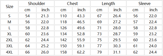 - Schnitt: Lockere Passform, nicht zu weit und nicht zu eng. Es kann als äußere Schicht getragen werden. Wenn Sie zwischen den Größen liegen, empfehlen wir, eine Größe größer zu wählen.