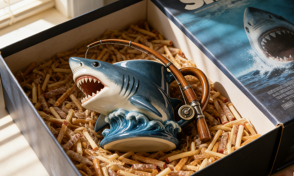 Der Hai und die Angelrute sind nicht gedruckt – sie sind skulptiert. Eingefroren im Sprung, im Kampf, im Höhepunkt des Fangs.