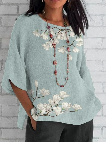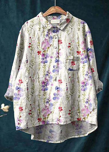 Women's Vintage Lovely Floral Art Print Casual Cotton And Linen Shirt