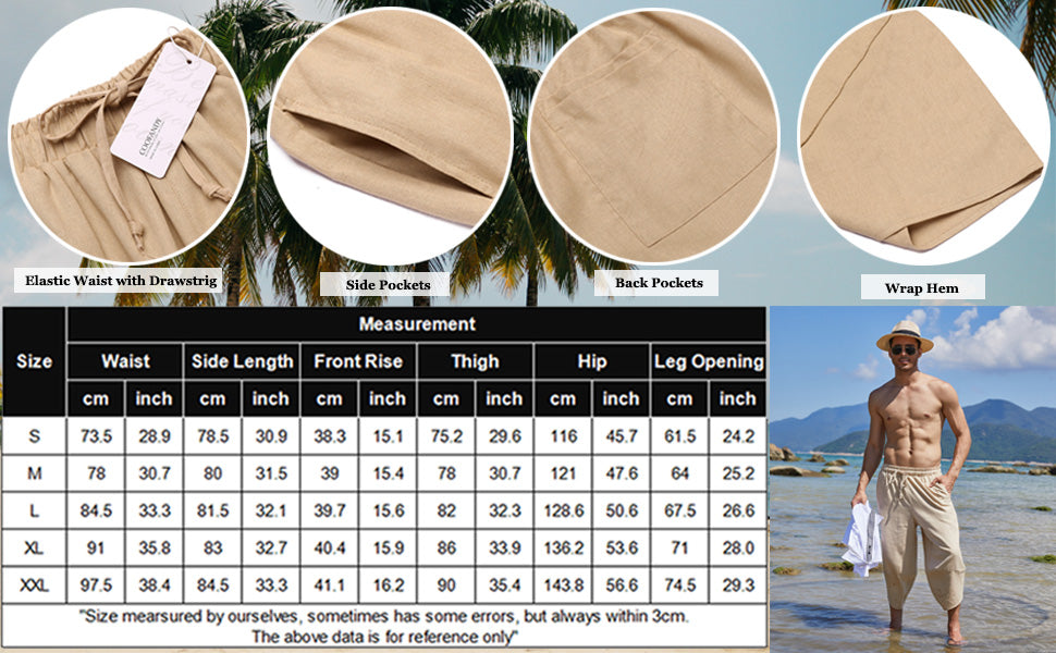 • Easy to Match: Create a more casual look and looks clean and elegant, you can try it with a linen shirt or a white t-shirt, vest, saloha shirts, sandal, canvas shoes, flip-flops and so on. This harem pants are suitable for both men and women.