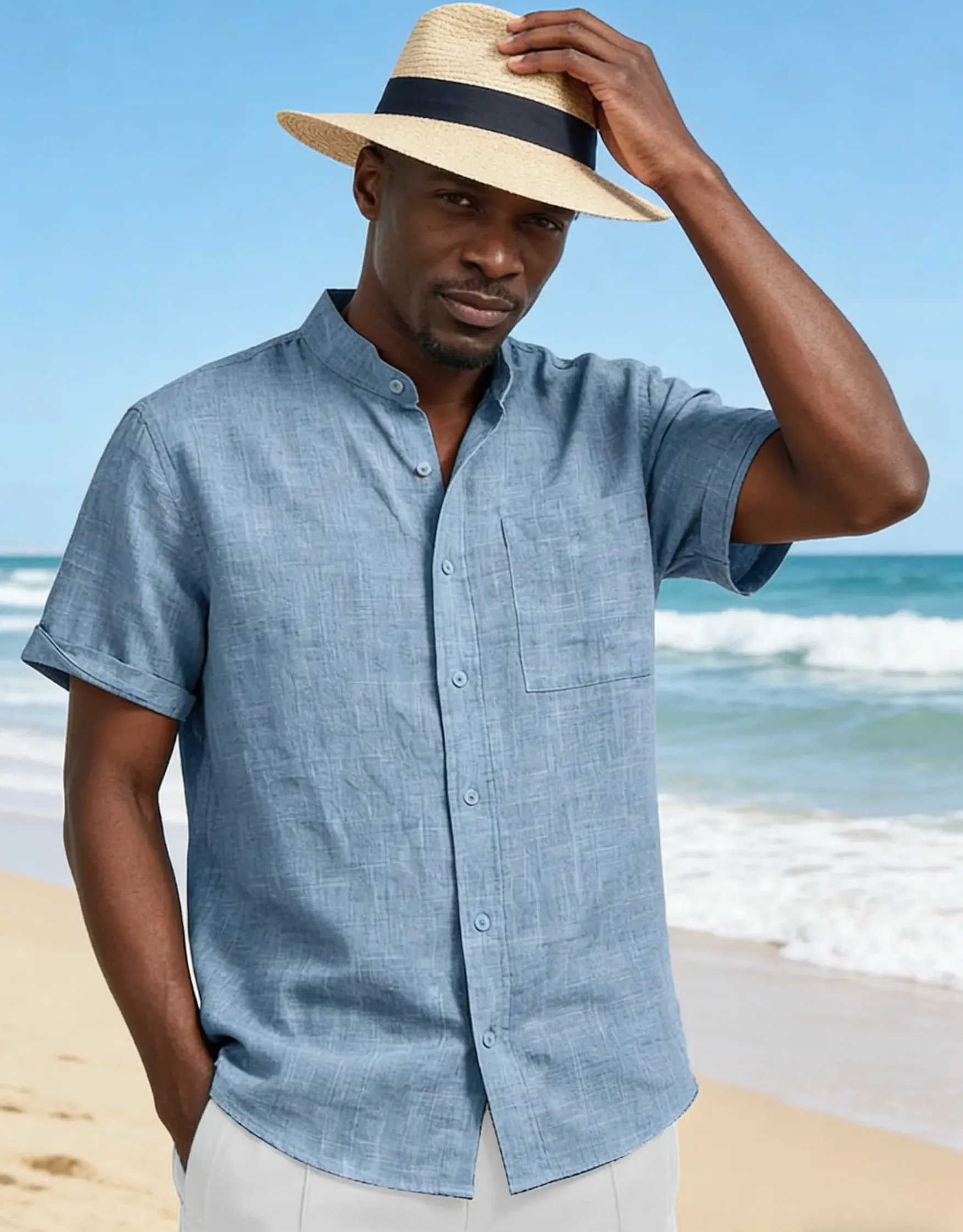 Elevate your summer wardrobe with the Men's Linen Casual Stand Collar Pocket Short-Sleeve Shirt—designed for the modern European and American man who values comfort, style, and timeless appeal.