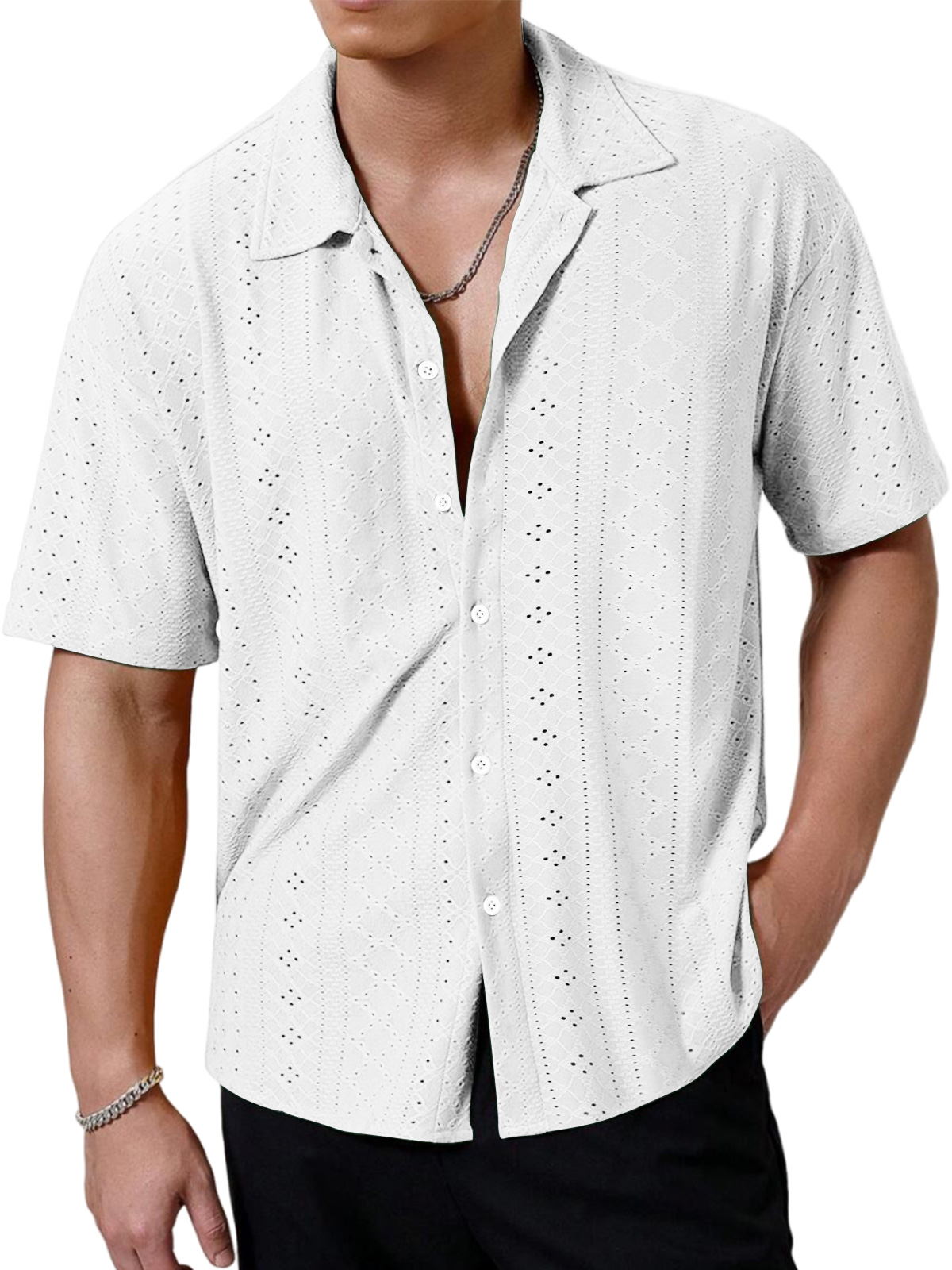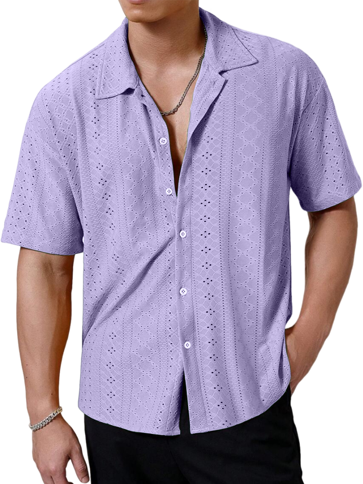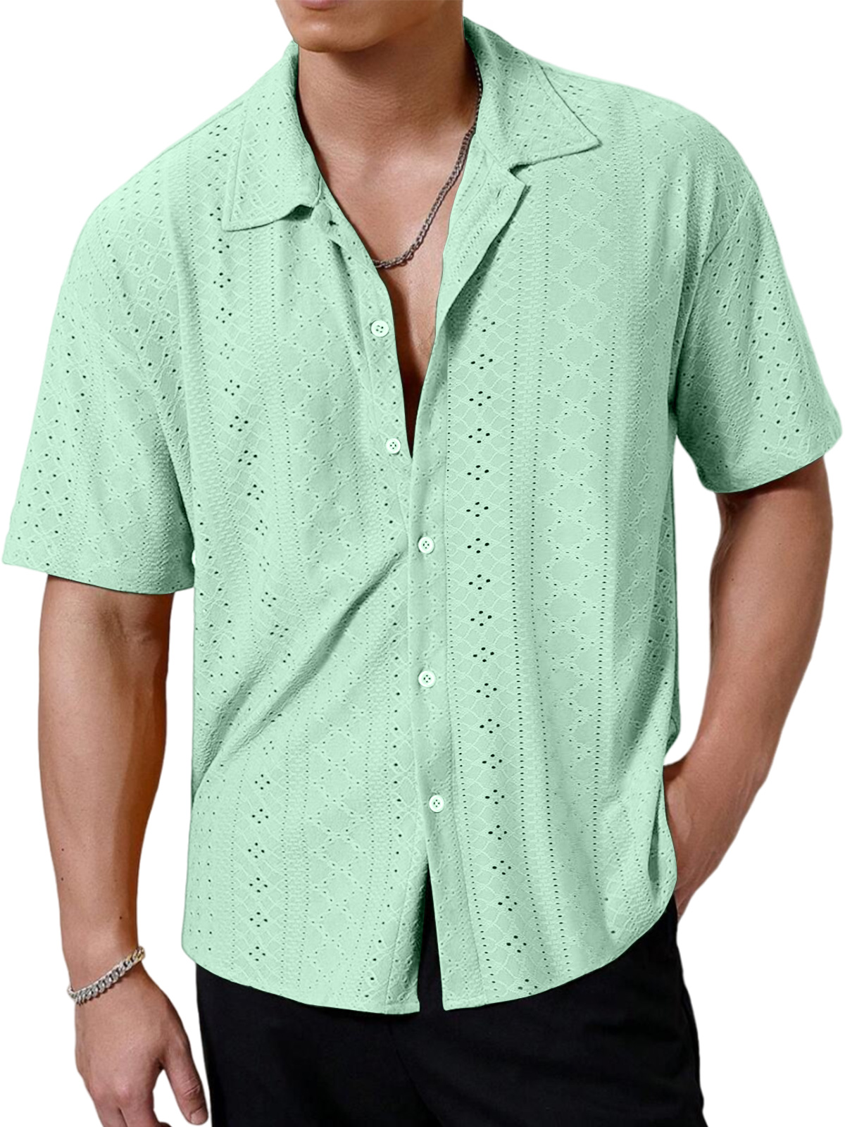 Men's Summer Solid Color Jacquard Lapel Short Sleeve Shirt