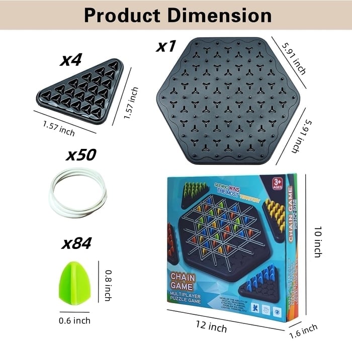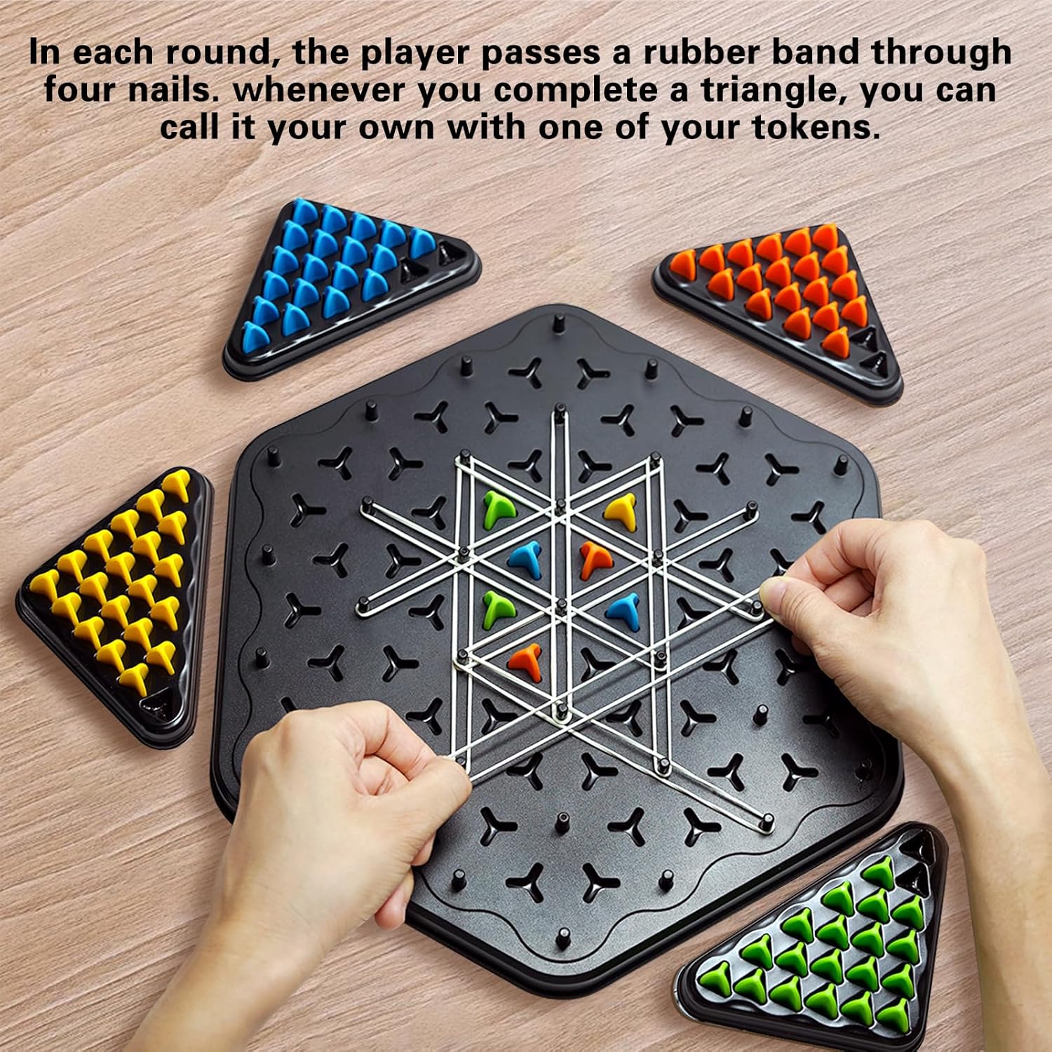 - PACKAGE INCLUDES:Ā 1 triggle game set - 1 game board, 4 token trays, 84 tokens in 4 colors, 50 rubber bands
